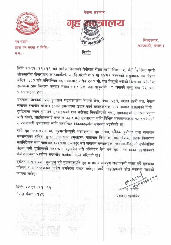 सोमबार बहिान पोखाराबाट आउँदै गरेको ग.२ ख १४२१ नम्बरको यात्रुबाहक बस धादिङको बेनीघाट रोराङ गाउँपालिका–५ स्थित भैंसीगौडामा दुर्घटना भएको थियो । दुर्घटनामा परेर १९ जनाको मृत्यु भएको राजमार्ग सुरक्षा तथा ट्राफिक व्यवस्थापन कार्यालय, रामनगरका एसपी डिल्लीनारायण पाण्डेले जानकारी दिए ।